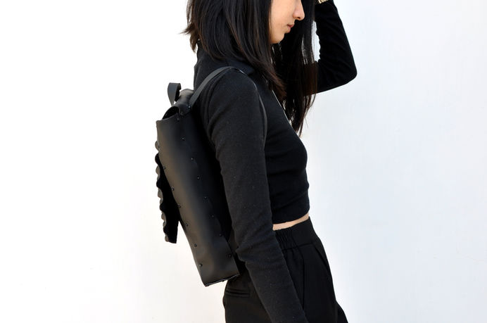 This bag was inspired by the turtle's back. Made from PVC, using the vacuum forming technique to make the spiky back. To link all the parts together and give the bag a more industrial look, I used thin black screws.